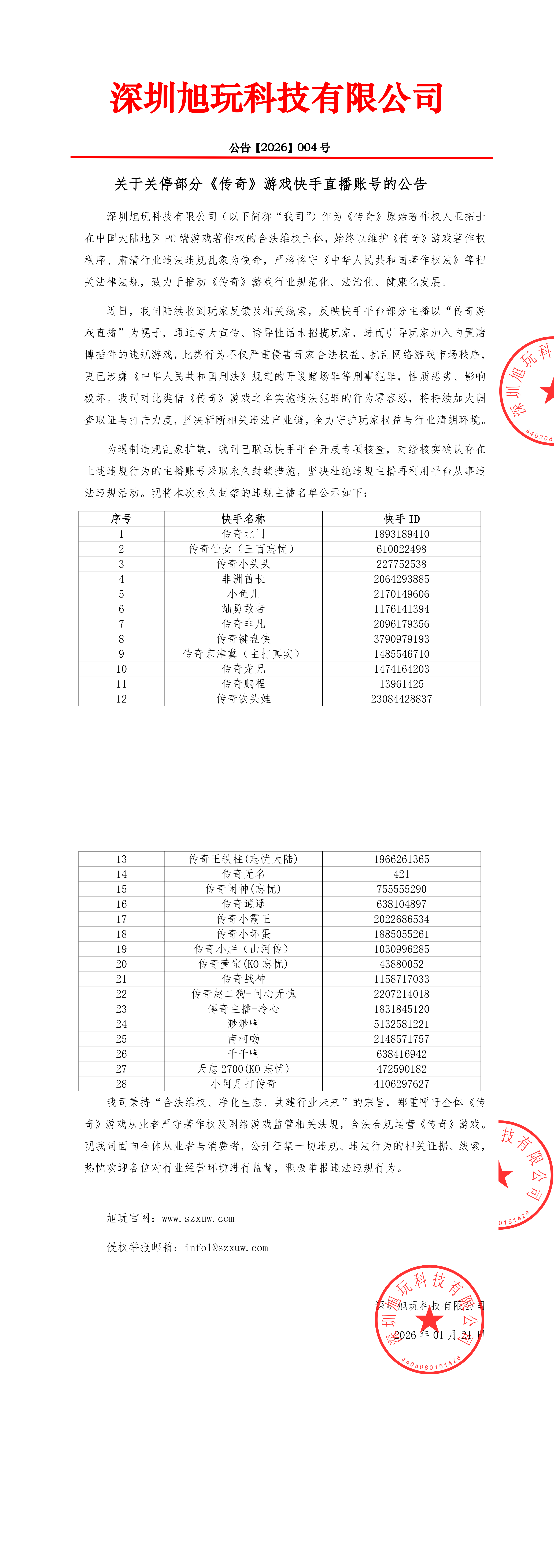 深圳旭玩科技有限公司(以下简称“我司”)作为《传奇》原始著作权人亚拓士在中国大陆地区PC端游戏著作权的合法维权主体,始终以维护《传奇》游戏著作权秩序、肃清行业违法违规乱象为使命,严格恪守《中华人民共和国著作权法》等相关法律法规,致力于推动《传奇》游戏行业规范化、法治化、健康化发展。