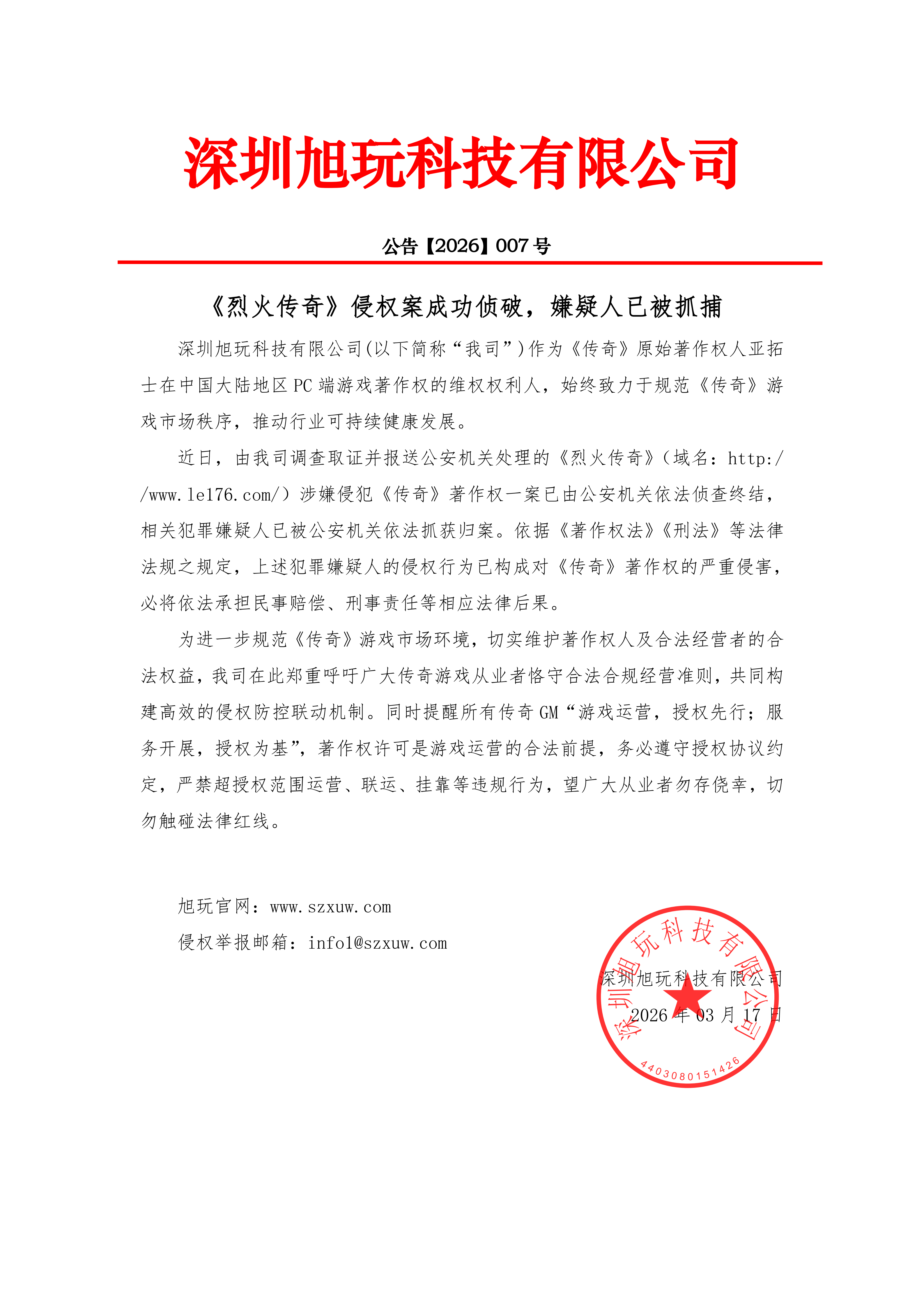 深圳旭玩科技有限公司(以下简称“我司”)作为《传奇》原始著作权人亚拓士在中国大陆地区PC端游戏著作权的维权权利人,始终致力于规范《传奇》游戏市场秩序,推动行业可持续健康发展。